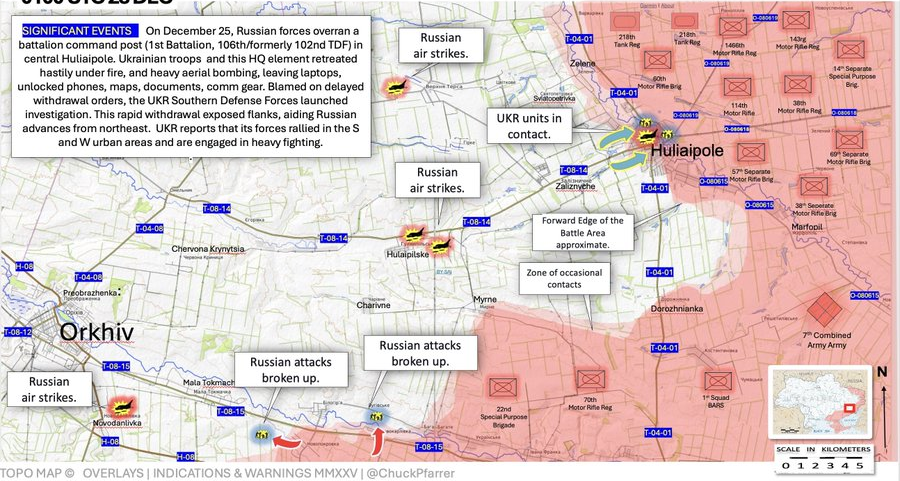 胡利亚波尔方向,12月25日,俄军占领了胡利亚波尔中部的一处营级指挥所(第1营,第106/原第102特遣防卫团)。乌克兰部队在交火中慌忙撤退,留下了笔记本电脑(部分仍在运行)、未上锁的手机、地图、文件以及印章。此次仓促撤军暴露了侧翼弱点,加速了俄罗斯从东北方向发起的攻势。