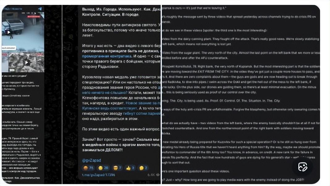 俄罗斯军事博主怒骂国防部弄虚作假,称所谓的“控制库皮扬斯克的证据”竟然是一段三名士兵从奥斯基尔河北岸逃离的视频,俄军目前“只能勉强守住左岸的几株植物。