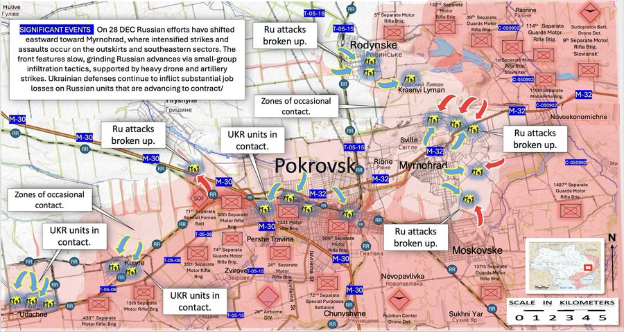 库皮扬斯克方向,自 2024 年末/2025年初开始渗透并占据城市部分区域的俄罗斯部队,目前仍有部分剩余人员,被孤立在局部区域或包围在中部/南部地区。